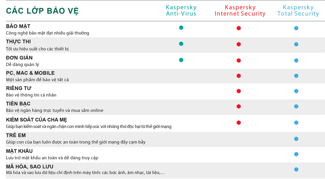 Kaspersky Total Security bảo vệ đa năng toàn diện cho tất cả các thiết bị PC, máy Mac, Android, iPhone & iPad trong gia đình. - Bảo vệ tránh các cuộc tấn công mạng - Bảo vệ toàn diện cho PC, máy Mac và Android - Bảo vệ sự riêng tư & dữ liệu cá nhân - Tăng cường bảo mật với ngân hàng trực tuyến - Bảo vệ và quản lý thời gian online của trẻ em trên PC & máy Mac - Duy trì hoạt động cho thiết bị - Đơn giản hóa công việc quản lý bảo mật